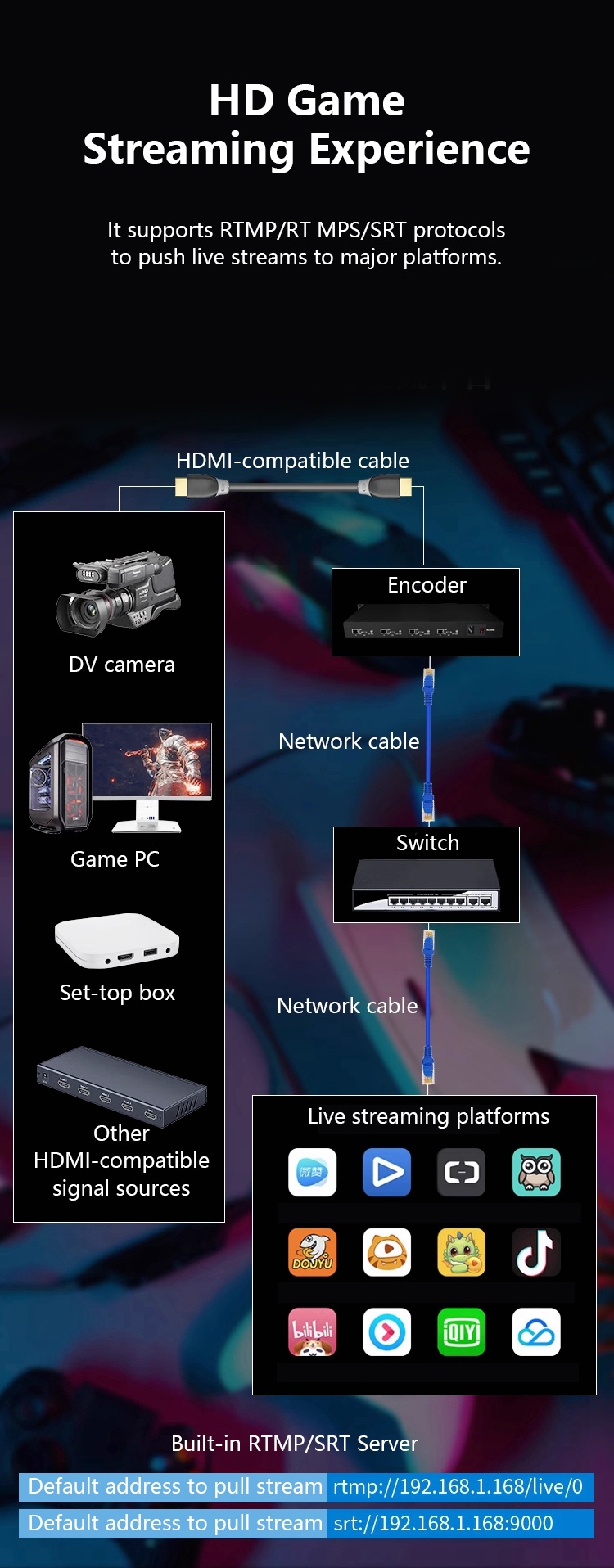 - Supports RTMP/RT MPS/SRT protocols to push live streams to major platforms. Default address to pull stream for RTMP is rtmp: //192.168.1.168/live/0. Default address to pull stream for SRT is srt: //192.168.1.168:9000
