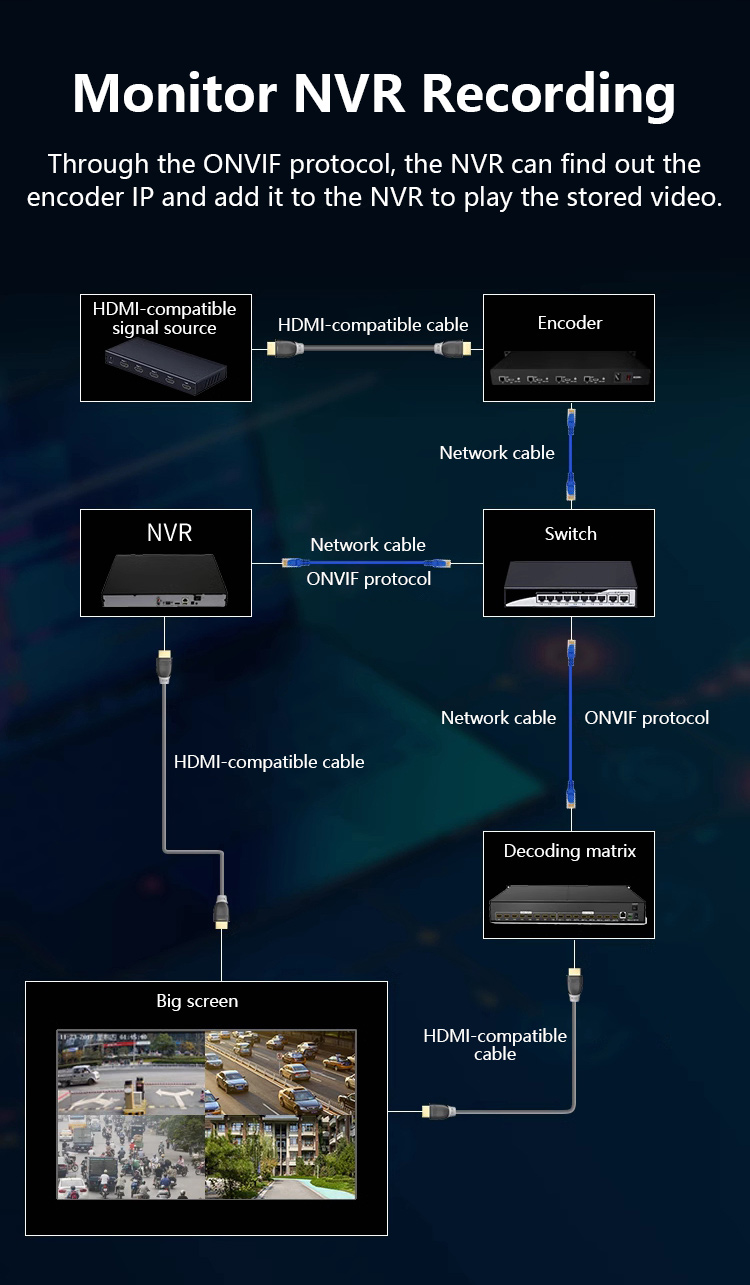 - Monitor NVR recording: Through the ONVIF protocol, the NVR can find out the encoder IP and add it to the NVR to play the stored video