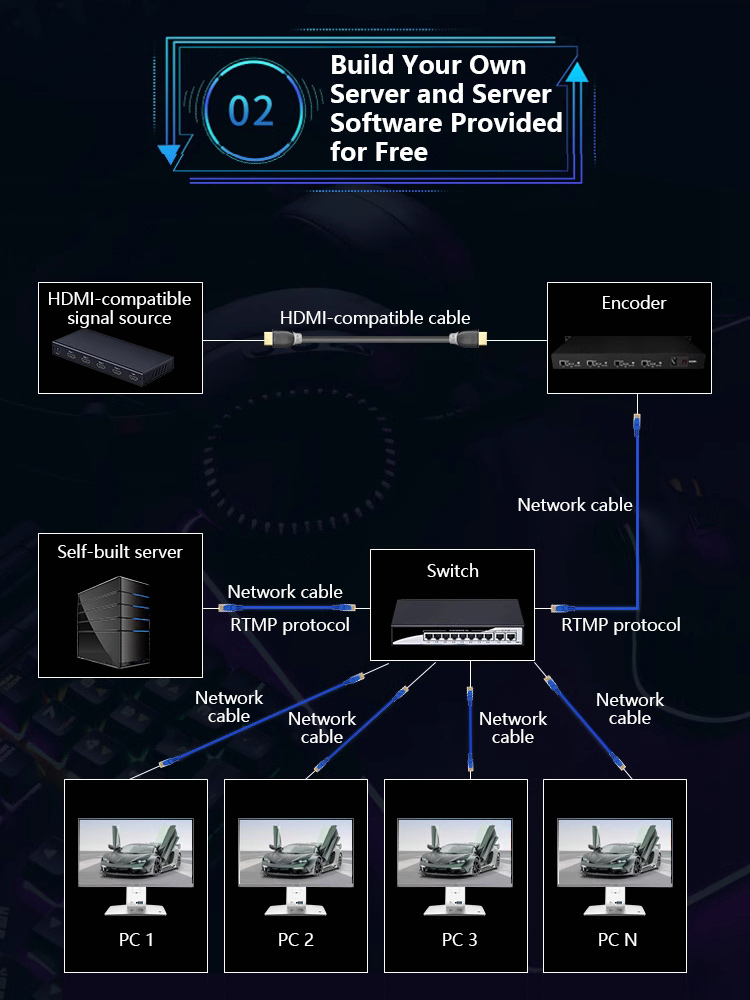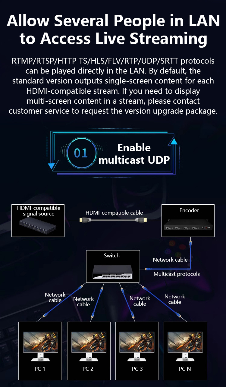- Support several people in LAN to access live streaming: RTMP/RTSP/HTTP TS/HLS/FLV/RTP/UDP/SRTT protocols can be played directly in the LAN. By default, the standard version outputs single-screen content for each HDMI-compatible stream. If you need to display multi-screen content in a stream, please contact customer service to request the version upgrade package