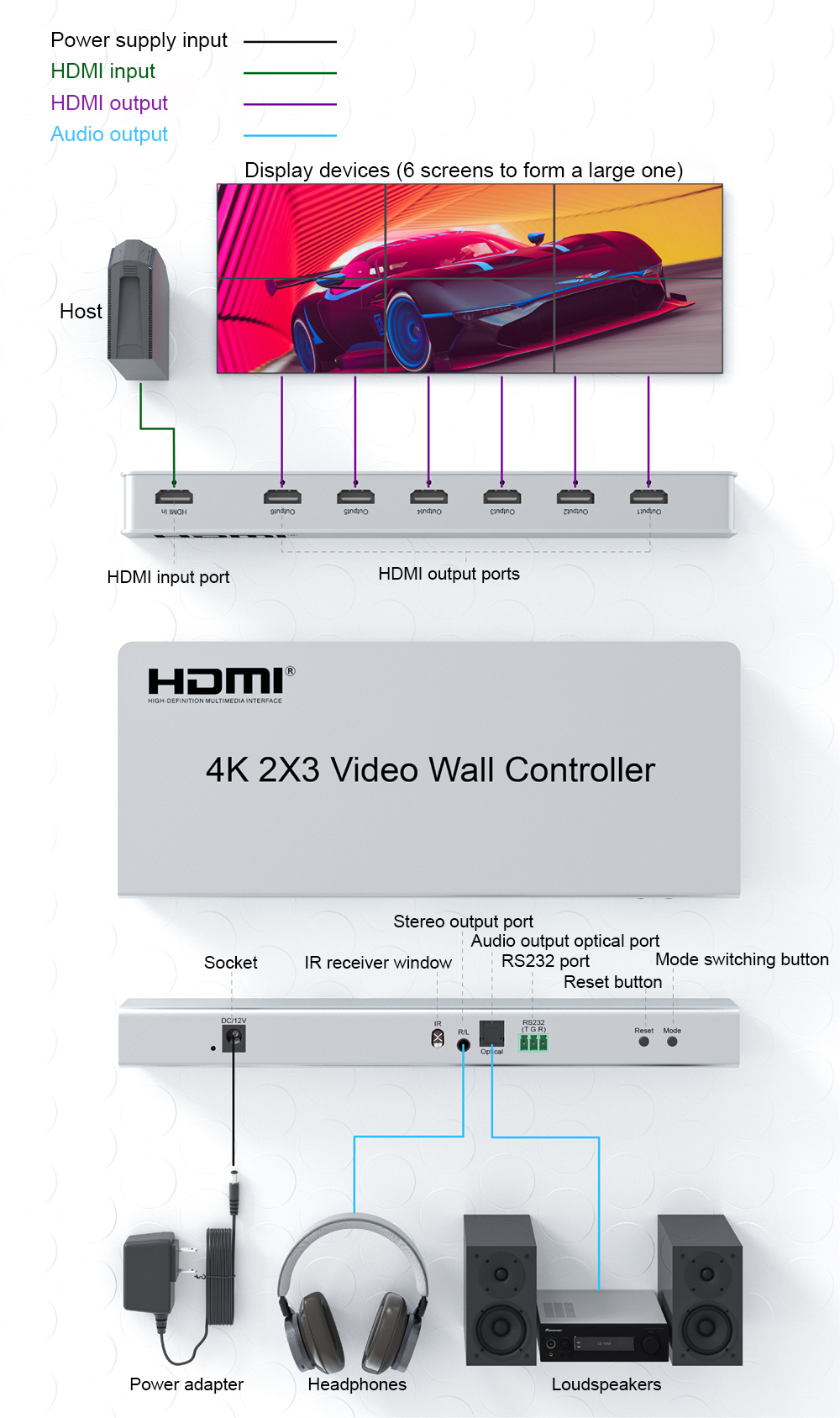 - HDMI 2x3 video wall controller: It supports HDMI 4K at 30Hz. Multiple splicing modes are supported. With independent audio output.
