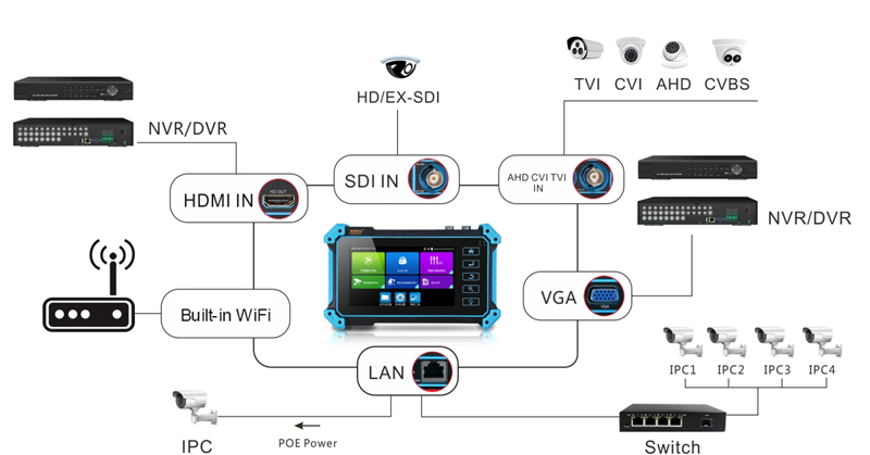 The 5 inch IPS touch screen IP camera tester is designed for maintenance and installation of IP analog, HD coaxial cameras as well as other security equipment. The 1920*1080 resolution enables it to display network HD cameras and analog cameras in high resolution. The unit supports many ONVIF PTZ and analog PTZ control, and cable test functions. CCTV installers often need to carry a variety of testing tools to complete their work. If take the all in one camera tester, making working conditions safer and increasing productivity.
