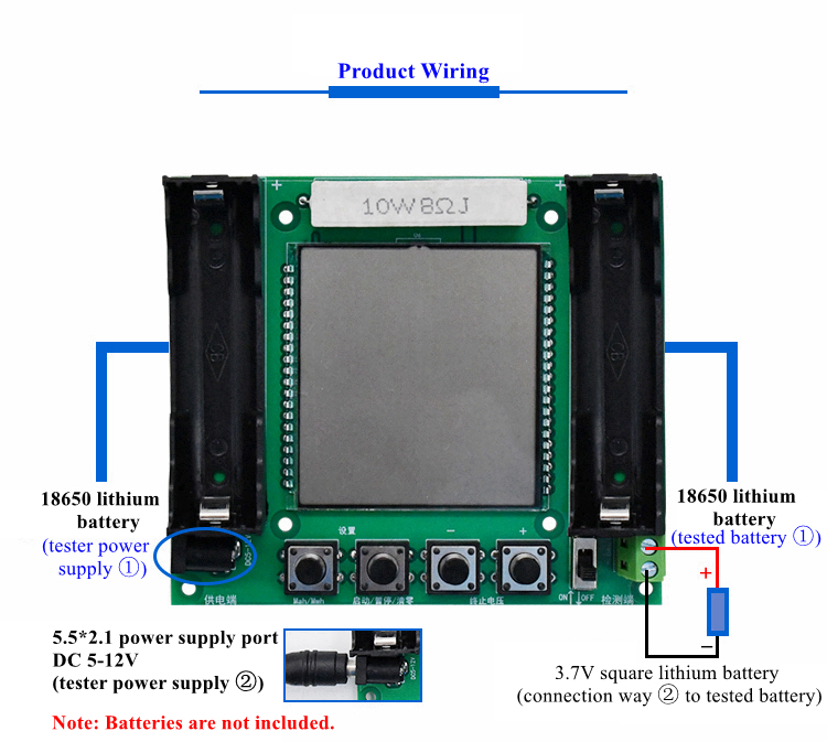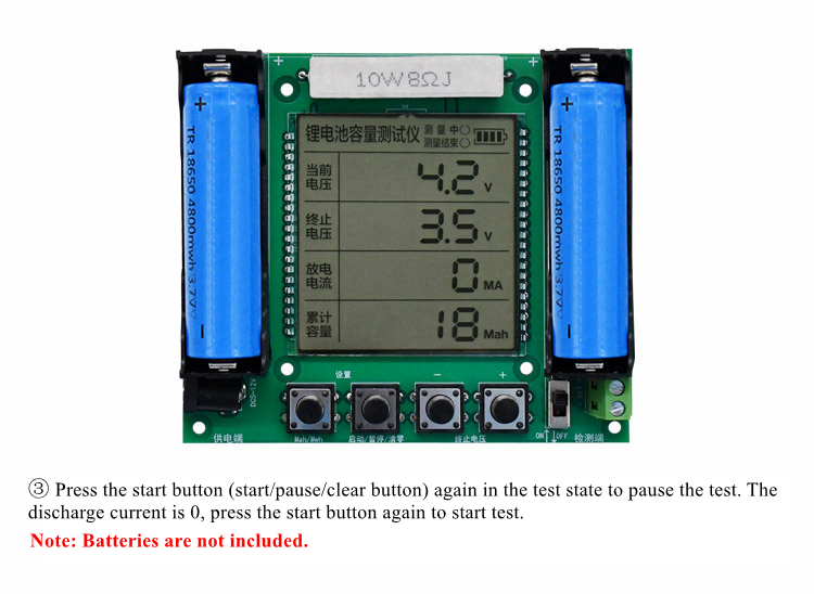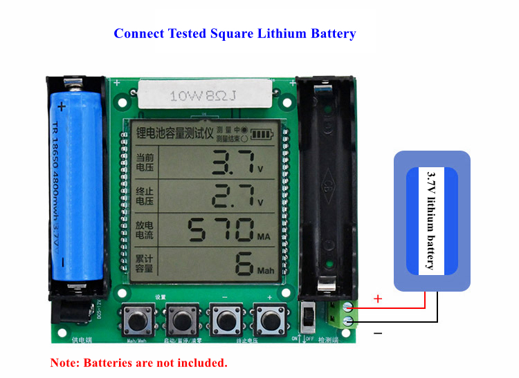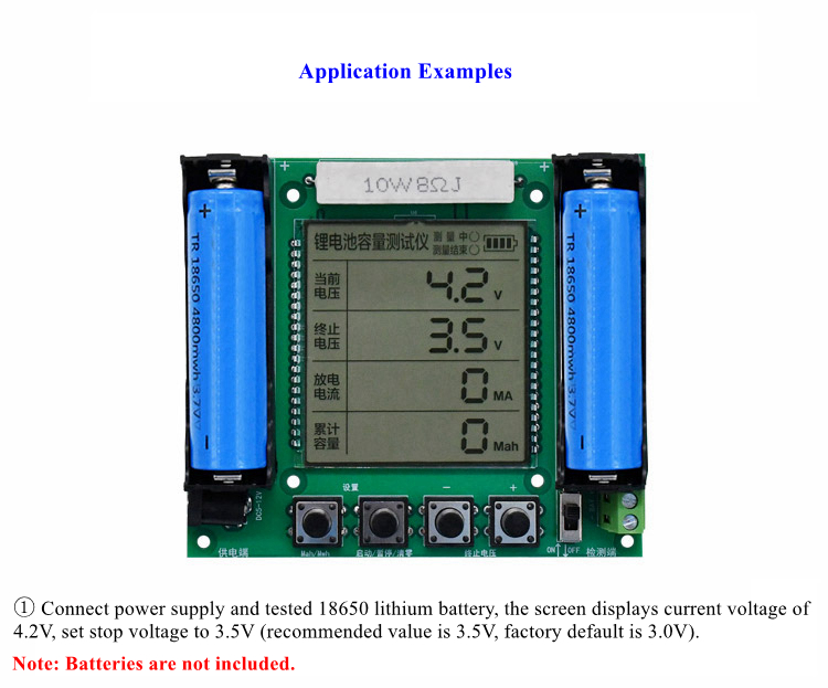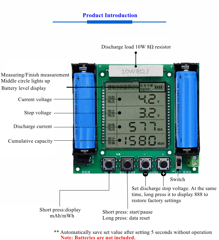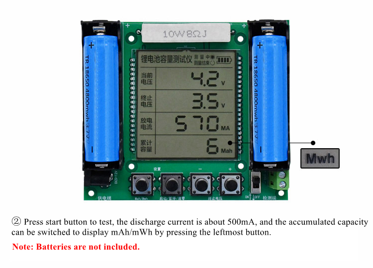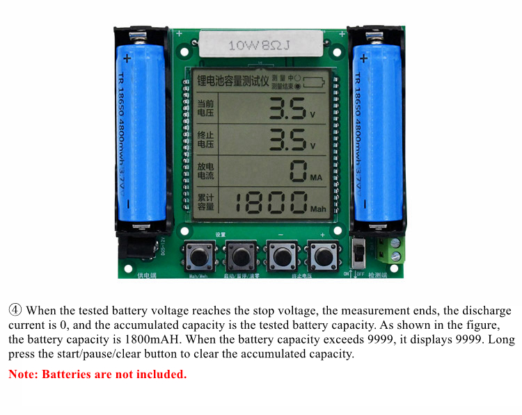Assuming that battery capacity is 2000mAH, the discharge current of the tester is about 500mAH (2000+500=4), and the measurement time is about 4 hours.