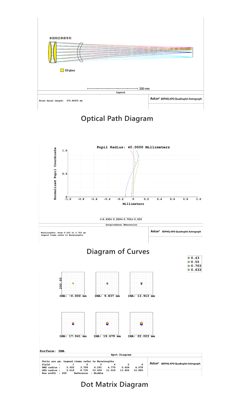 - 80PHQ inherits the optical design of the PHQ series, adopting a 3+1 quadruplet lens structure which contains two pieces of ED glass that can effectively reduce chromatic aberration and enhance clarity and sharpness. It’s worth mentioning that all astronomical telescopes from PHQ series are integrated lens combination design rather than simply placing three major lenses and a corrector together in a line. In another word, the whole optical system cannot solely perform without any piece of these lenses. This structure design leads to a more rational lens arrangement, better vignette control and superior image quality.