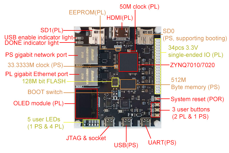 - SD card: PS's SD0 and SD1, and SD0 is bootable (support SD cards up to 32G)