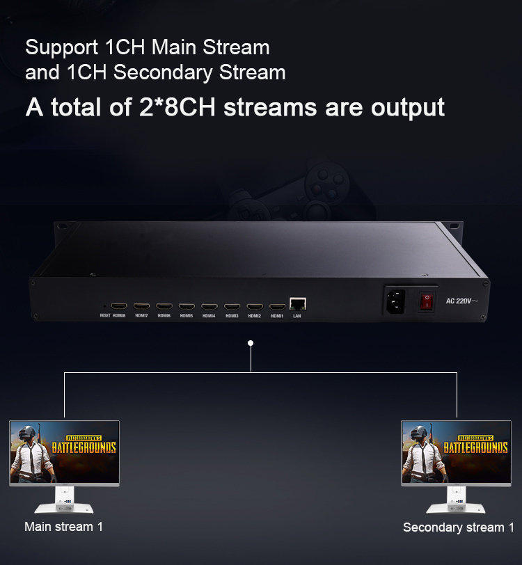 - Support 1CH main stream and 1CH secondary stream. A total of 2*8CH streams are output