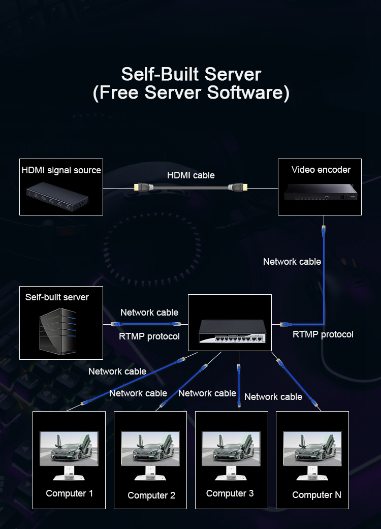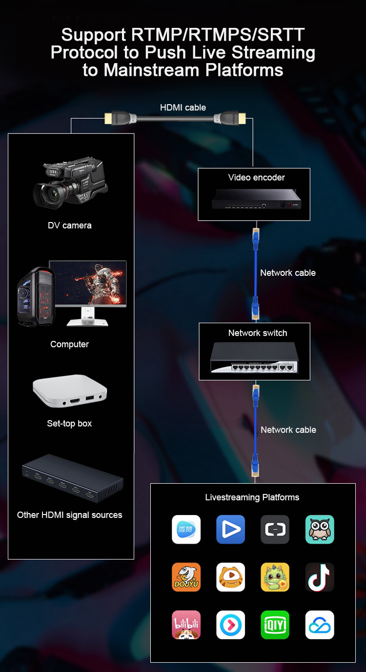 - Support LAN multi-person access to livestreaming. Support RTMP/RTSP/HTTP TS/HLS/FLV/RTP/UDP/SRT protocol for direct playing in the LAN. The standard version defaults to the output of single-screen content per HDMI stream, if you need to display multi-screen content in one stream, please find customer service for the upgrade package of this version