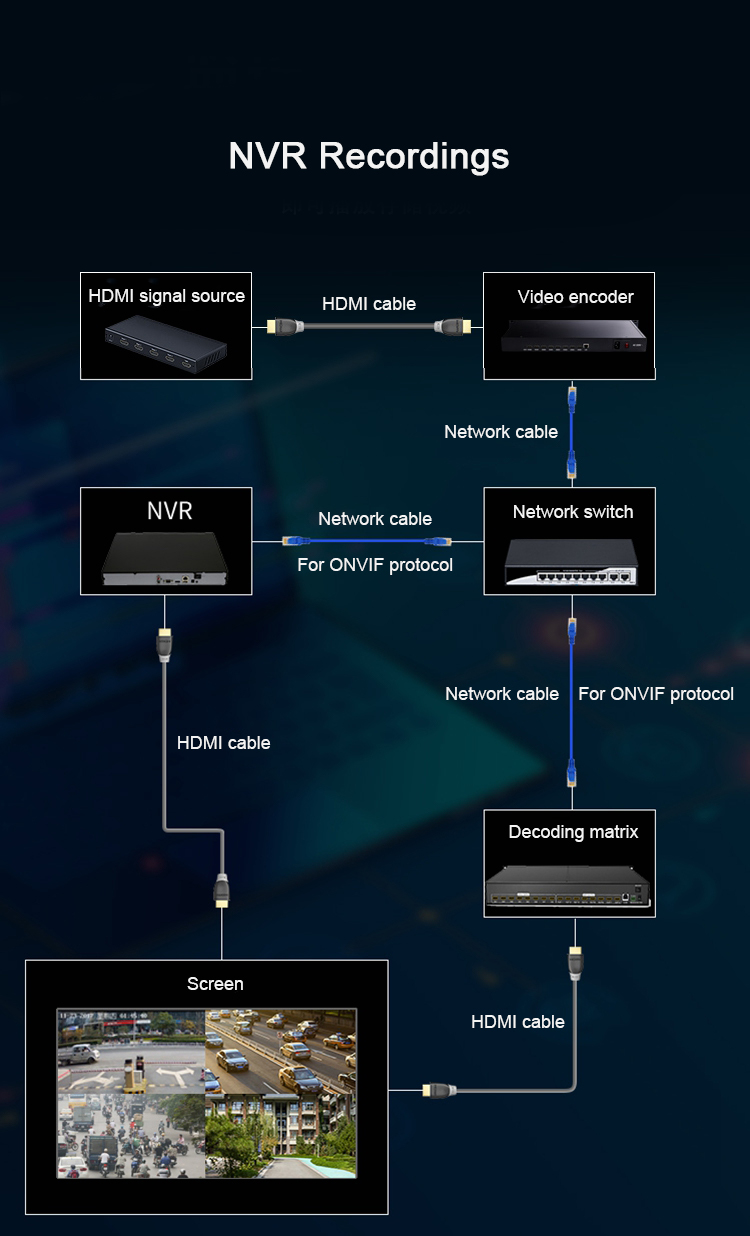 - NVR recordings: Through the protocol for ONVIF, the NVR can find the 8 IPs of the encoder, and add 8 HDMI channels to the NVR to play the stored video