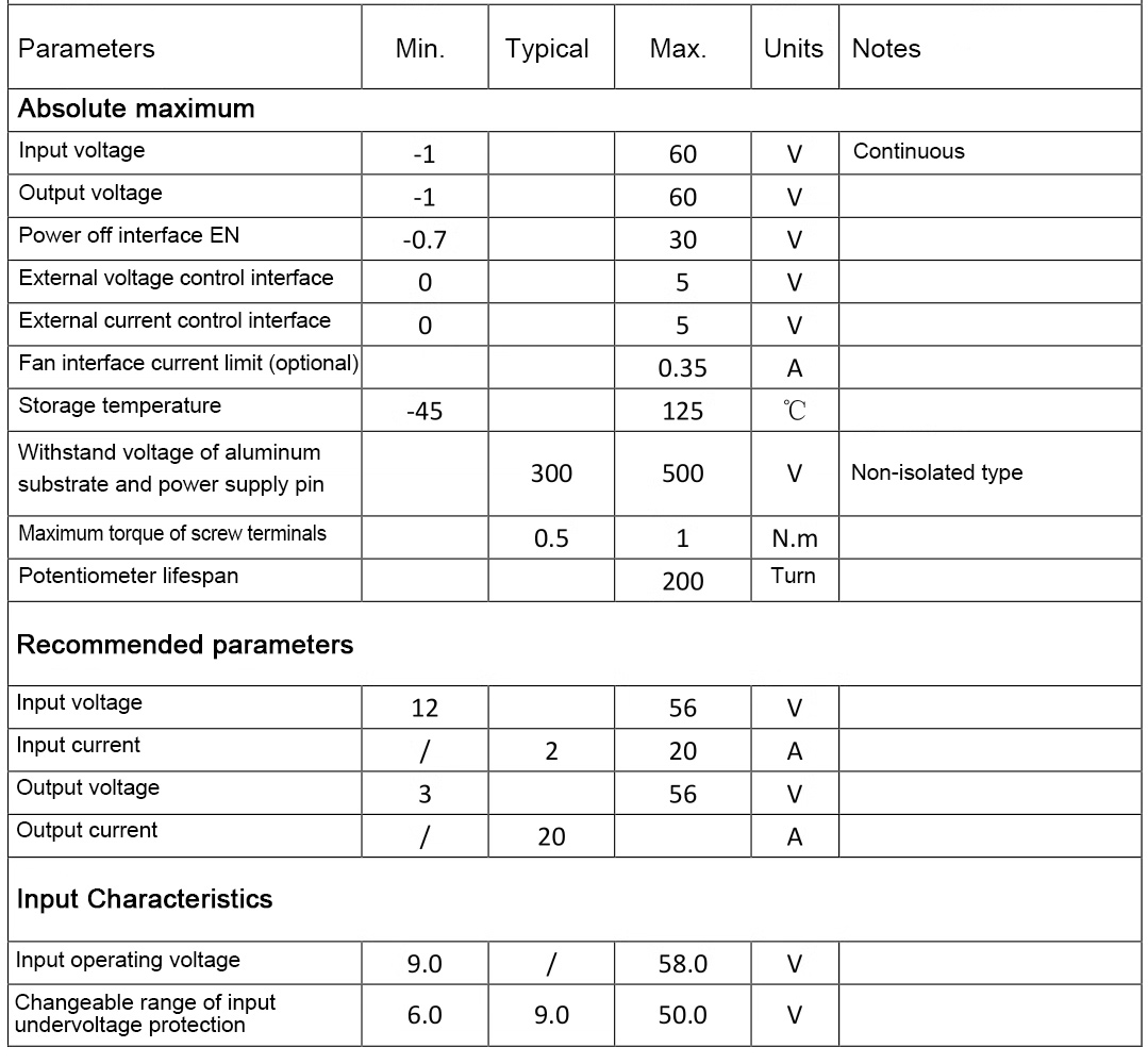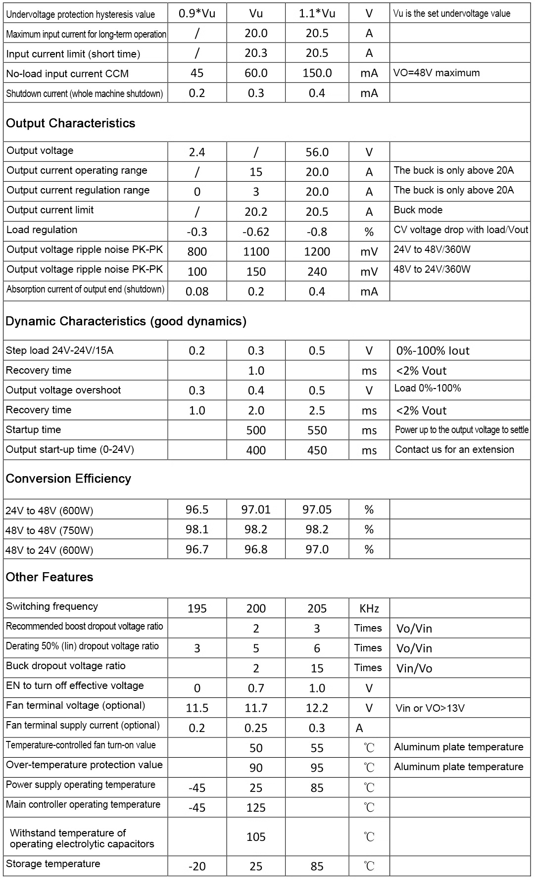 1. Please calculate whether the maximum load is suitable according to lout=VIN*Iin*(0.92-0.98)/Vout. The parameter range needs to be within the above values, and Iin(max) = 20A can fit all parameters. For example, Vin=12V, Vout=24V, lout=10A. Vin=48V, Vout=24V, Iout exceeds 15A.