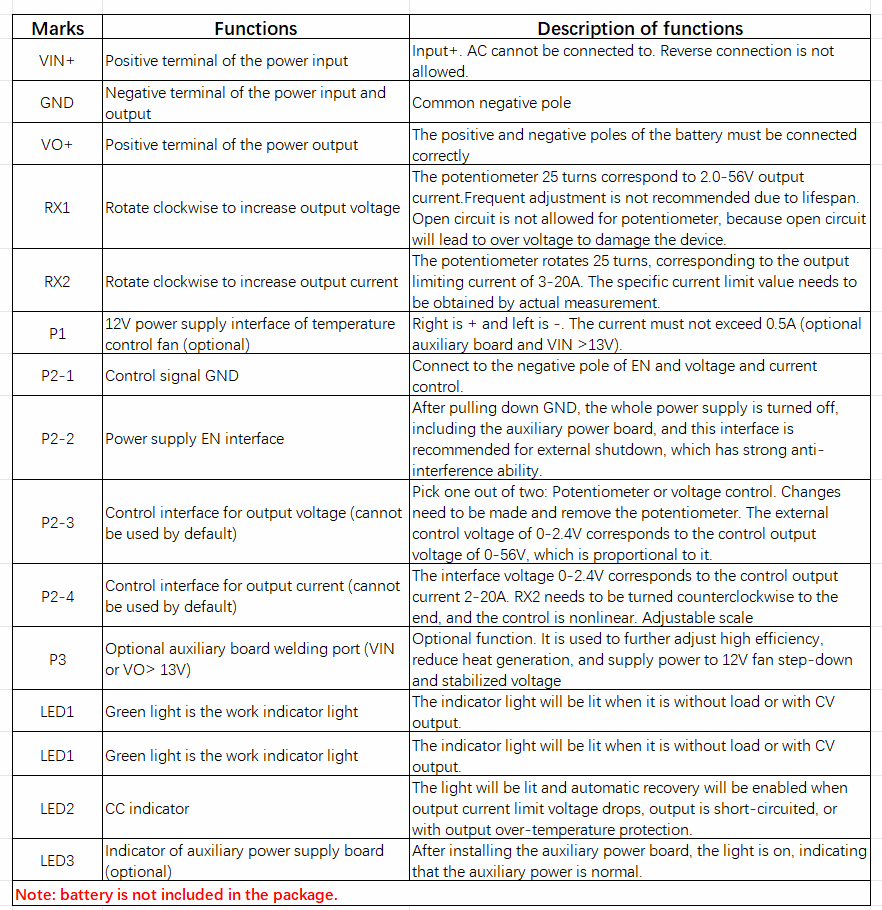 3. Battery can be connected for charging. The output voltage must be properly adjusted before connecting to a target battery. Do not connect batteries with a height set voltage.
