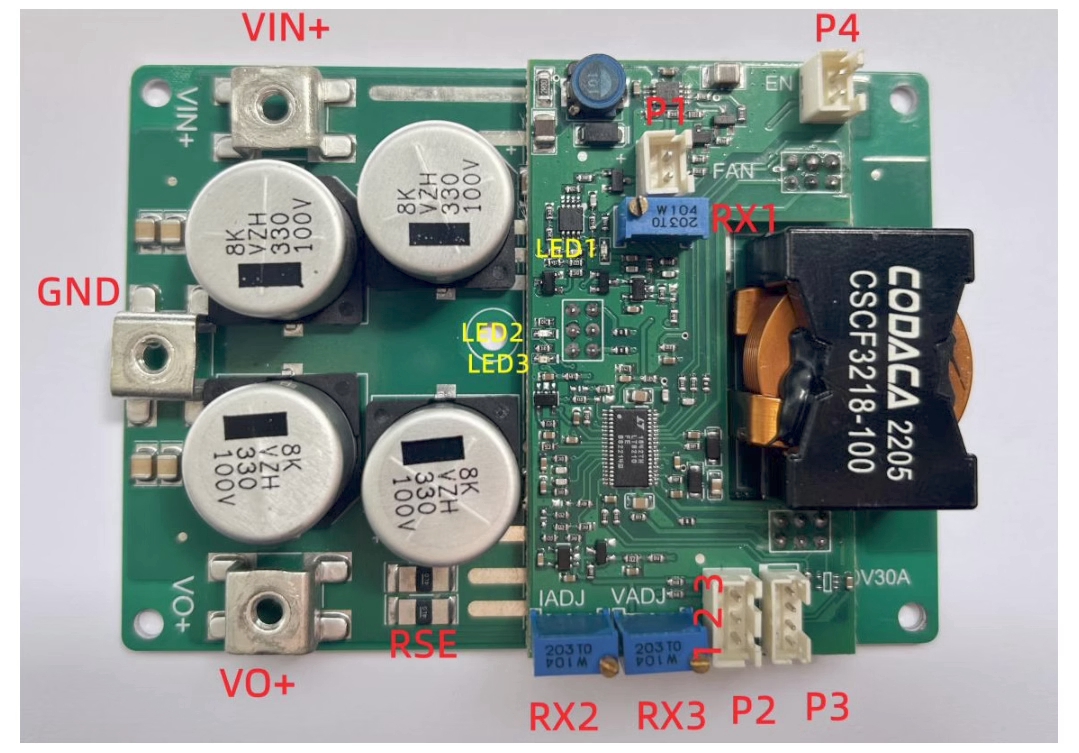 - When testing this power supply, it must be ensured that the input source can provide a large enough current (>35A) to ensure that the power supply does not collapse or even be damaged.