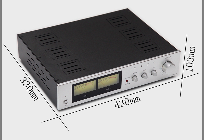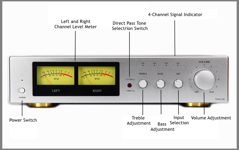 - 200W + 200W, dual VU meter indication, support direct-pass function and treble/bass adjustment.