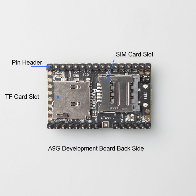 - The A9G development board carries lithium battery charging management, microphone, speaker interface, USB communication interface, multiple user buttons/led, TF card slot, SPI interface, I2C2 interface, and ADC interface.