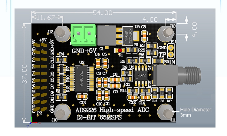 The high-speed AD of this module uses 12-bit high-speed A/D converter AD9226. AD9226 uses a multi-stage differential pipeline architecture, with a maximum sampling rate of 65MSPS. The chip is powered by a single power supply, with a sample holder and reference voltage source on-chip, which simplifies the design of peripheral circuits. Meet industrial-grade applications, and ensure no missing codes in the entire operating temperature range.