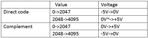 (4) Direct code: (-5V~+5V, 12-bit value increment), complement code: (D11 is the sign bit, D10~D0 is a number).
