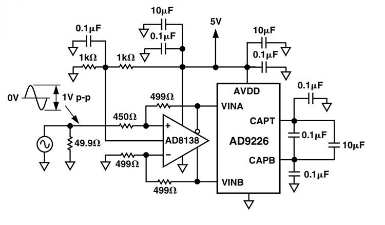 AD9226 is powered by a single power supply. It features 12-bit precision, 65Msps high-speed analog-to-digital converter, on-chip integrated high-performance sample-and-hold amplifier (Sample-and-hold amplifier SHA) and reference voltage source. AD9226 uses a multi-stage differential pipeline structure with error correction logic to ensure accurate 12-bit data at 65Msps sampling rate. At the same time, AD9226 also has lower power consumption (475mw) and higher SNR (69dB).