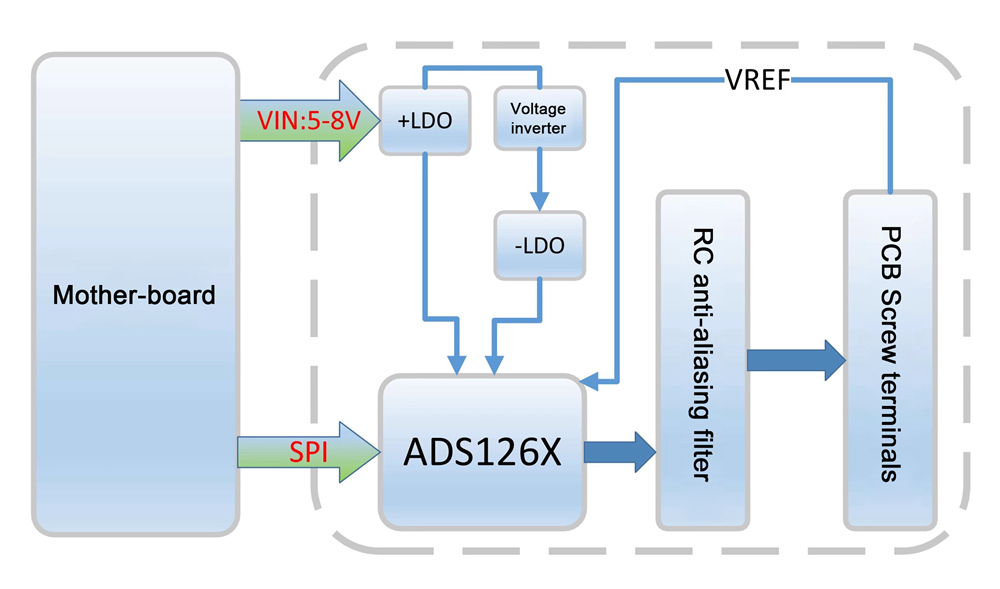 * Pre-filter: low-temperature drifting metal film resistor + C0G multilayer ceramic capacitor constitute a low-pass filter. This improves total harmonic distortion, reduces resistive and capacitive electronic thermal noise, and provides the ADC with an excellent anti-aliasing filter that avoids aliasing noise contaminating the signal. At the same time, it eliminates the effects of overdrive signals outside of the filter bandwidth.
