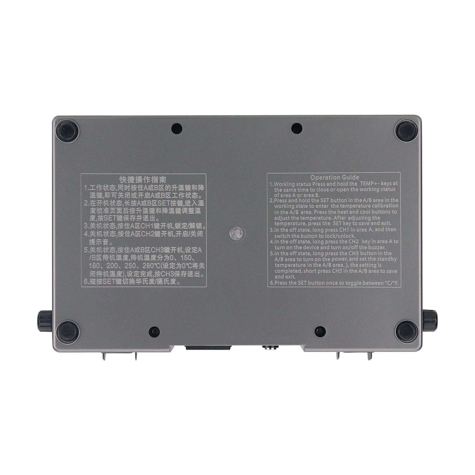 In shutdown state, press and hold CH3 button in zone A/B to start up and set the standby temperature in area A/B. The standby temperature is divided into 0℃, 150℃, 180℃, 200℃, 250℃ and 280℃. When the setting is 0°C, the standby temperature will be closed. After the setting is completed, short press CH3 in zone A/B to save and exit.