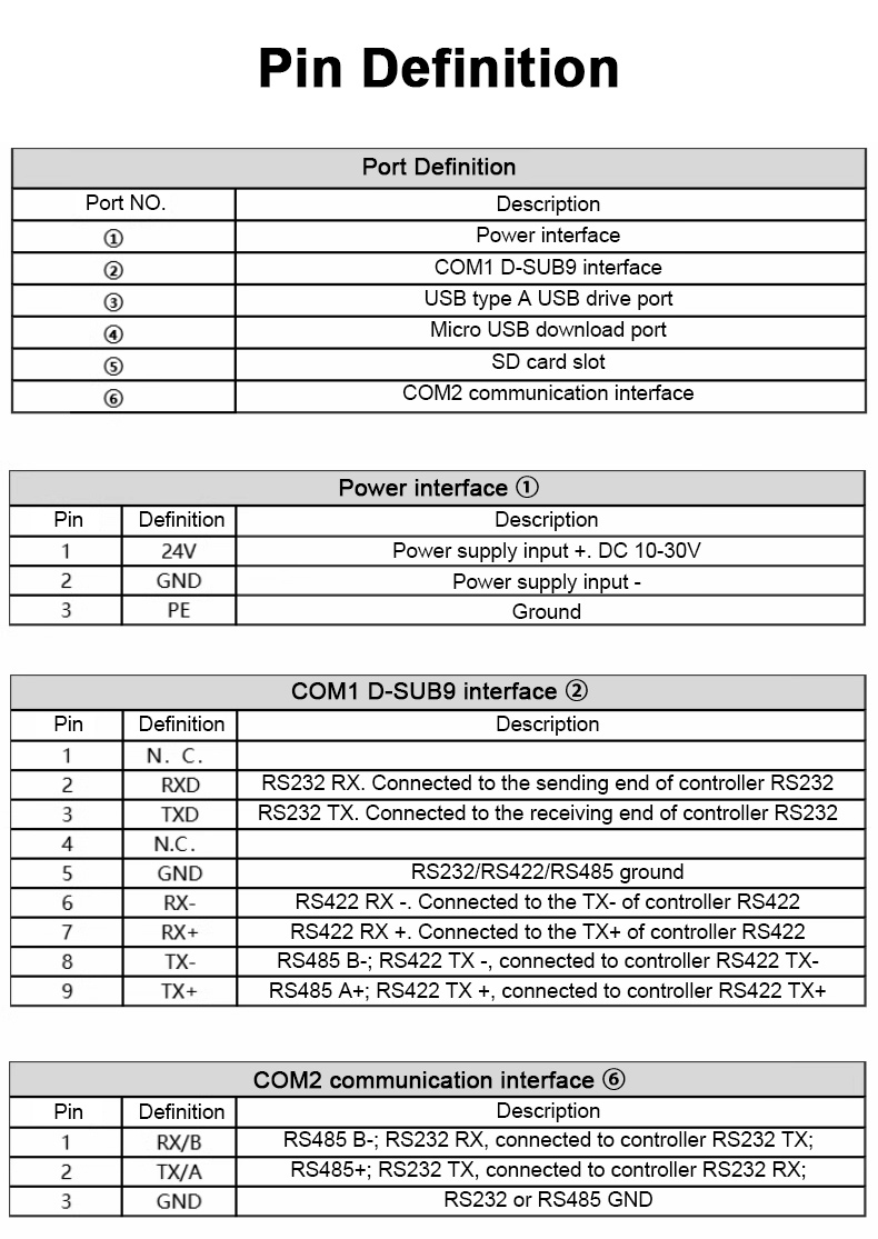 - Communication port: one serial port supports COM1 communication (RS232/RS485/RS422 communication)