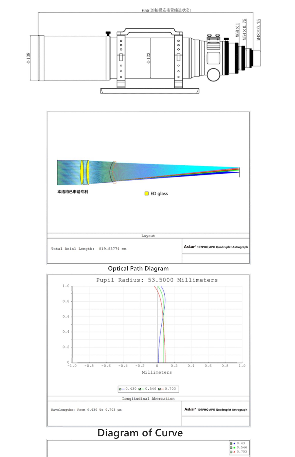 - 107PHQ adopts a quadruplet optical lens combination with a focal ratio of 7, with two of them being ED glass. Therefore, 107PHQ has excellent color difference control ability, which can effectively correct color difference issues even when visually magnified to 300 times.
