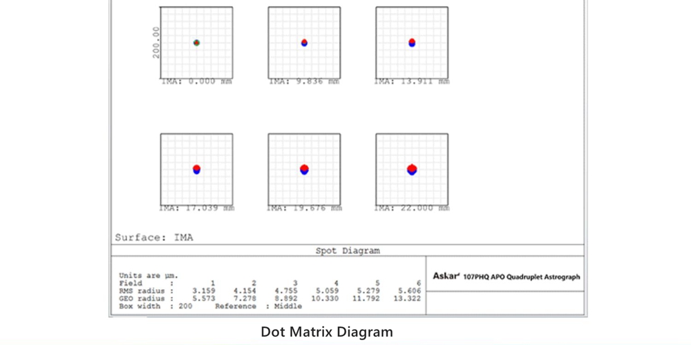 - Due to its flat field design, 107PHQ has strong advantages in astronomical photography. It not only supports full-frame digital SLR 44mm image circle, but also has minimal deformation of surrounding stars. The RMS radius of the central star point in the field of view is only about 3 microns, and the stars are delicate, which can meet the strict requirements of experienced players for stars. The overall image field is very flat, and the surrounding dimming is also excellent.