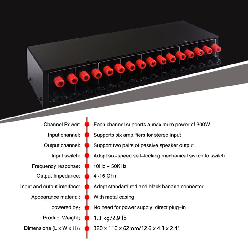 - Input passageway support up to 300W power amplifier and all types loudspeakers from 4Ω to 16Ω