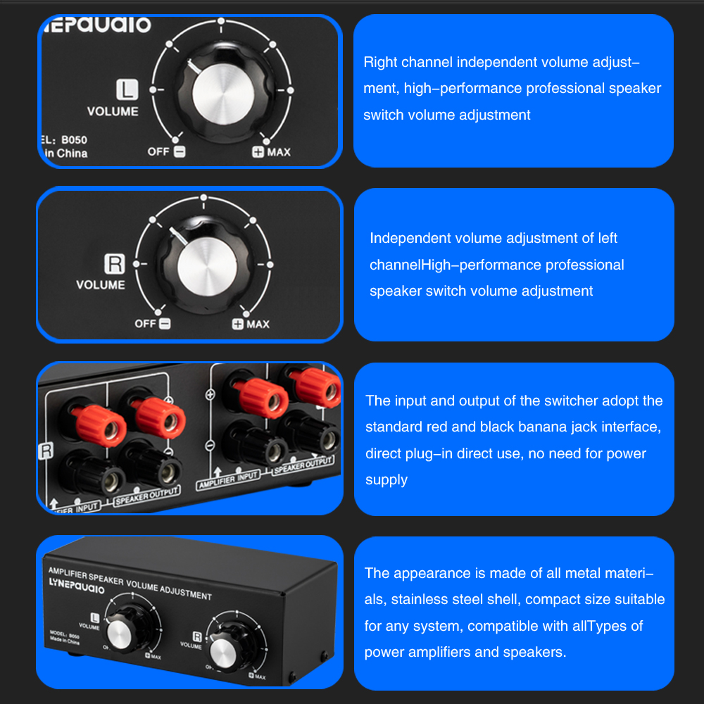 Desktop type power amplifier output passive speaker volume control box, it can easily control the volume of the sound channel of the passive sound box, easy for installation, just plug it in and use it. There is a separate volume knob switch, Metal construction, brief outward and Compact Size.