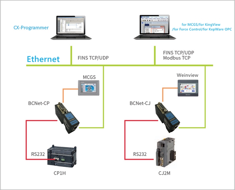 - BCNet-CJ adopts a plug and play design, which does not occupy the PLC communication port. The programming software/upper computer software monitors PLC data through Ethernet, while the touch screen can communicate with the PLC through a multiplexing interface. BCNet-CJ supports the vast majority of SCADA software in the industrial control field, and supports for Omron FINS TCP/UDP Ethernet protocol and Modbus TCP.