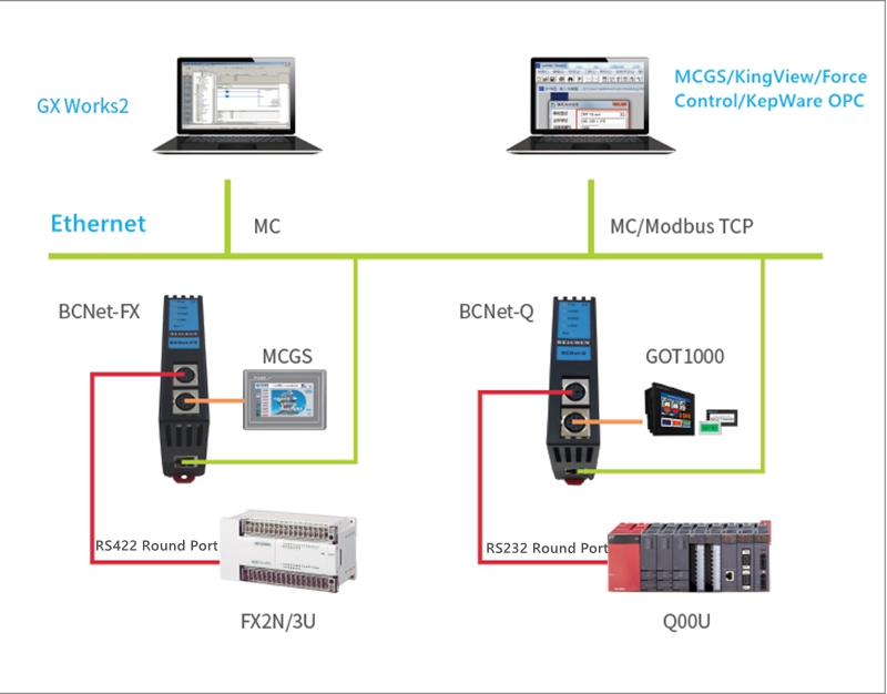 - BCNet-FX adopts an industrial grade design, with guide rail installation and communication cable. Without occupying the PLC programming port, the upper computer monitors PLC data through Ethernet, while the touch screen can communicate with the PLC through the multiplexing interface X2. BCNet-FX supports the vast majority of SCADA software in the field of industrial control, and supports two communication methods: for Mitsubishi MC Ethernet protocol and ModbusTCP.