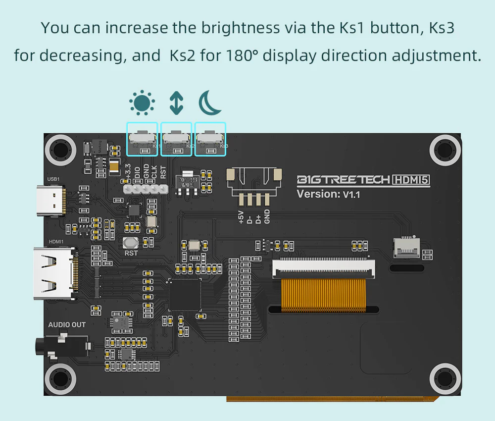 - Adjustable brightness and display direction. You can increase the brightness via the Ks1 button, Ks3 for decreasing, and Ks2 for 180° display direction adjustment (Refer to the following product detail image).