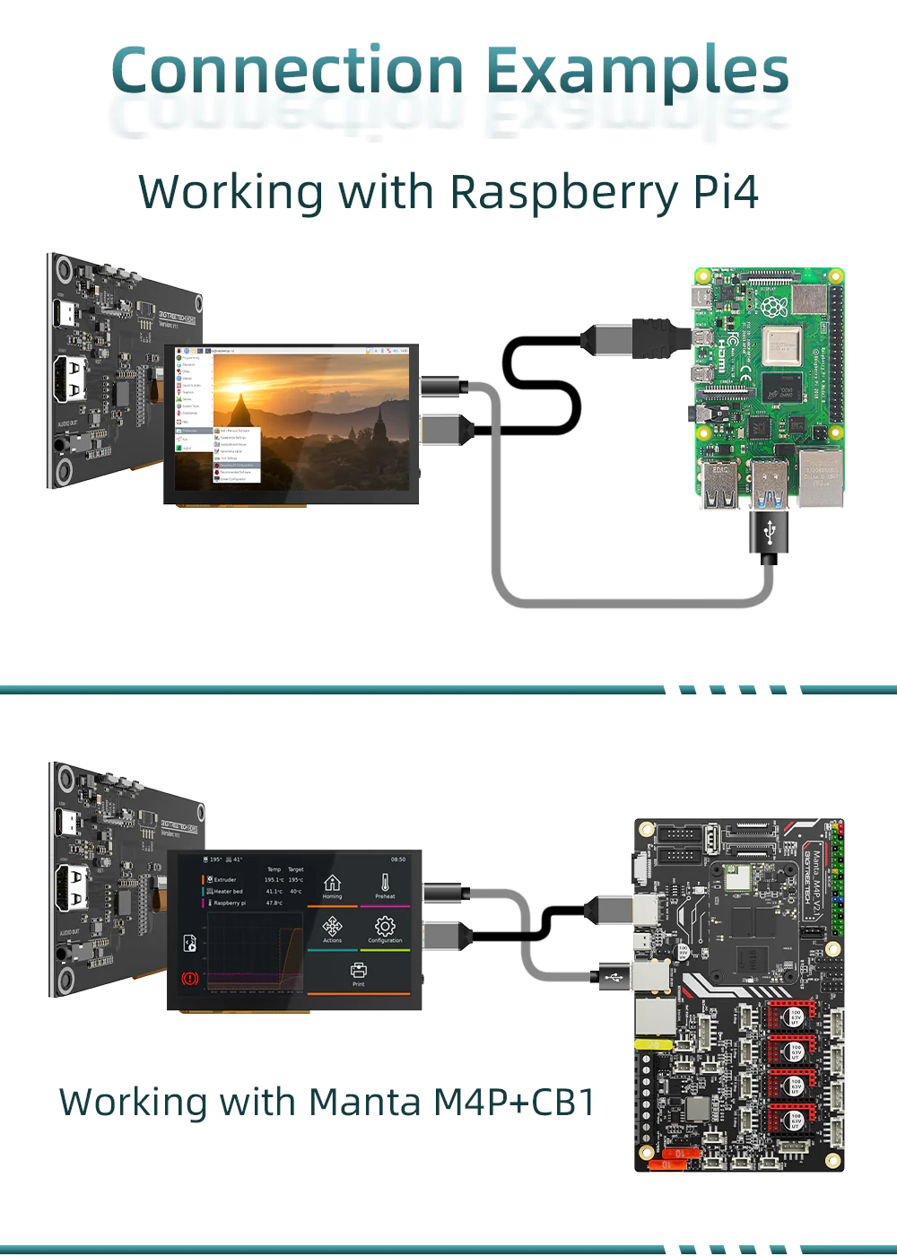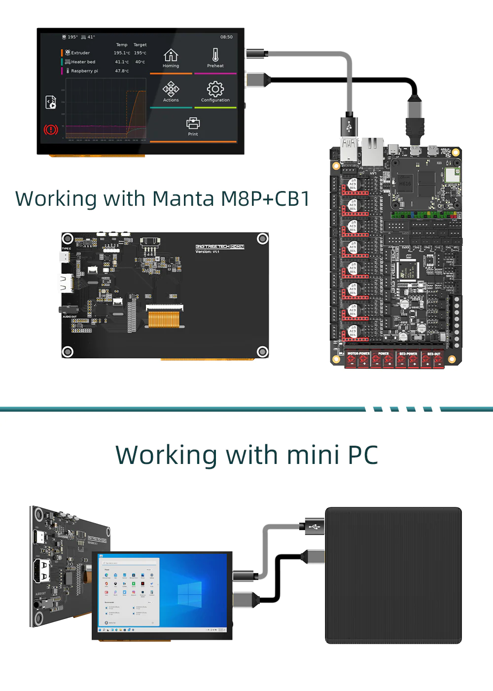 - Plug and Play. Simply connect the screen to the device via the HDMI port and power the Type C port to make it functional without installing any drivers. This screen is great for 3d printer users to DIY their projects, and it can perfectly be compatible with the Manta series motherboard plus CB1. Let it add a more seamless visual experience to your printer system.