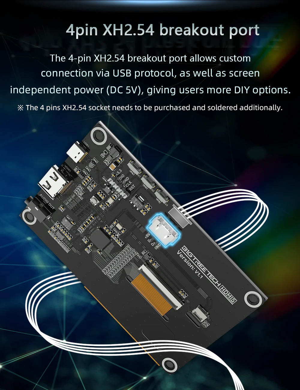 - 4pin XH2.54 breakout port. The 4-pins XH2.54 breakout port allows custom connection via USB protocol, as well as screen independent power (DC 5V), giving users more DIY options.