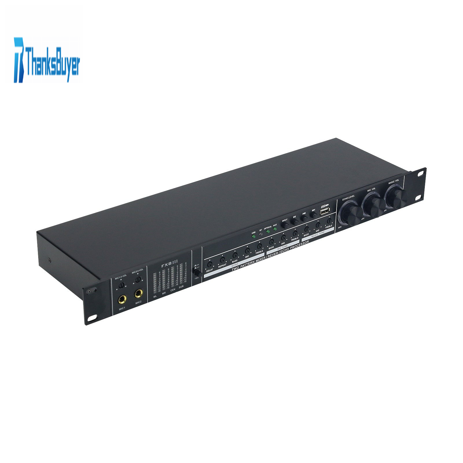 - The preamplifier is a karaoke effector with Bluetooth transmission and optical fiber digital audio transmission functions, and has USB playback function. A variety of transmission modes are integrated, and the transmission mode is switched by one button. The reverberation, music, microphone, treble, alto and bass pitch can be adjusted independently, and it is easy to operate.