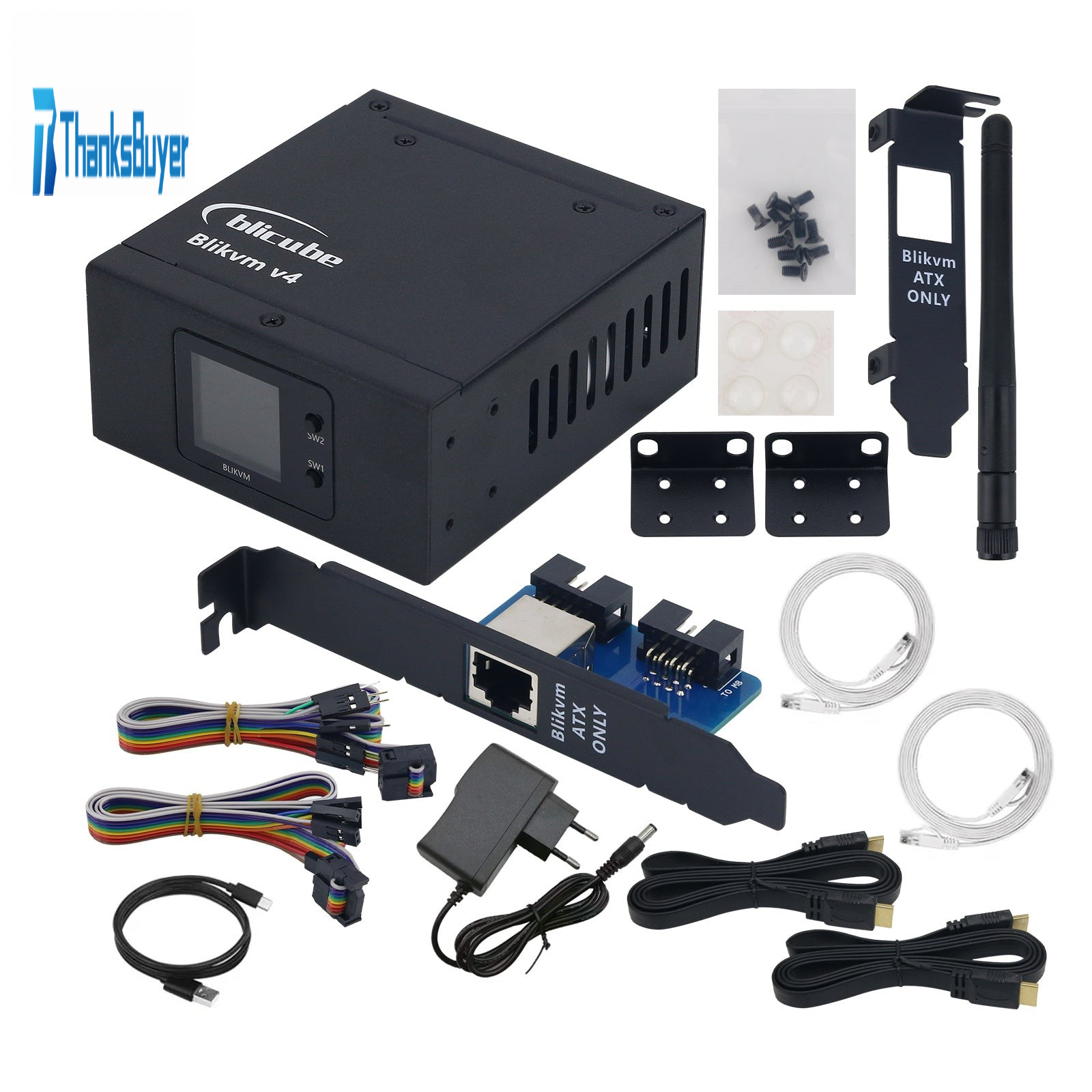 - Kit 1 Packaging List: 1 x BliKVM V4 + 12V 2A Power Adapter + 2-meter Network Cable + 1-meter HDMI-compatible Cable + 1-meter USB-C to USB-A Data Cable
