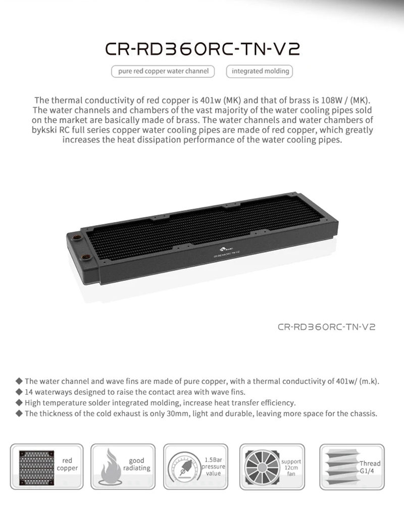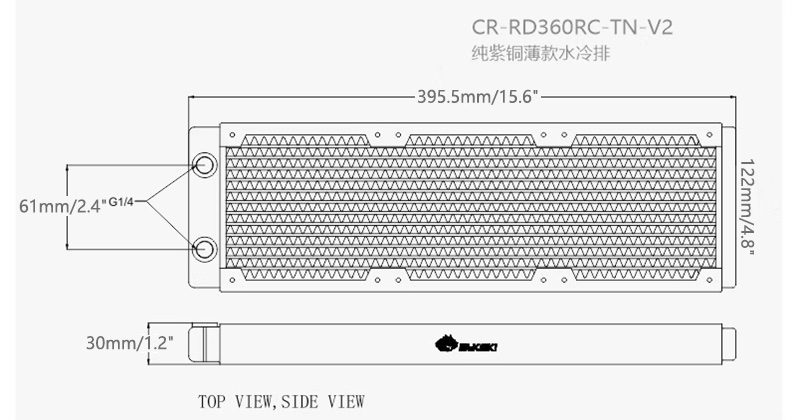Bykski 360mmx30mm/14.2x1.2" Copper Radiator (CR-RD360RC-TN-V2) radiator is designed as a single row of copper channels. The thickness of the radiator is 30mm/1.2" which gives this radiator more cooling surface area. The water channels and wave fins are made of red copper with a thermal conductivity up to 401 w/(M.K.). There are 14 water channels aligned in a single row.