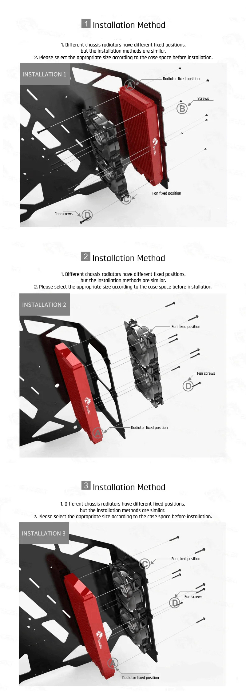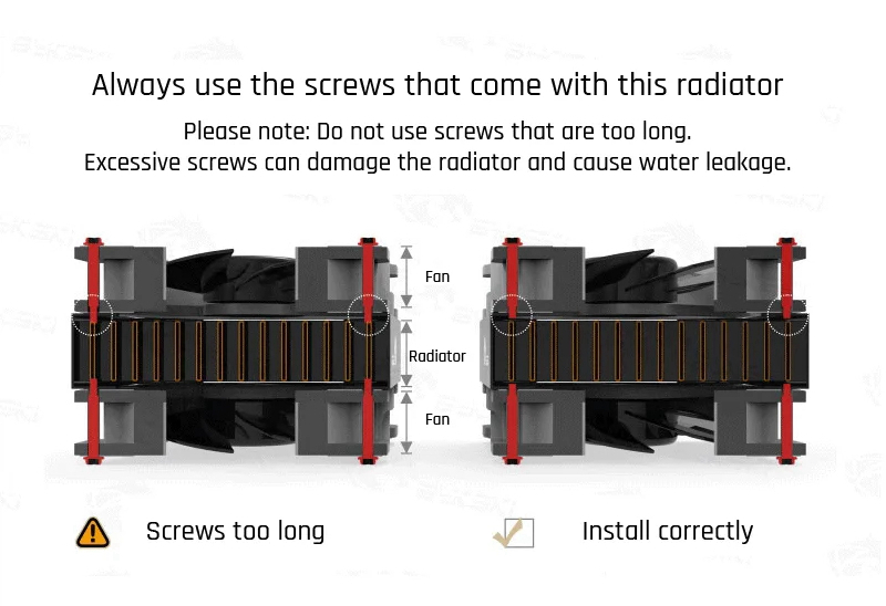 - Please pay attention to the length of the screw. If the screw is too long, it will break through the radiator and cause water leakage, voiding the warranty. The radiator comes with M3X30mm screws suitable for 120mm/4.7" fans of 25mm/1" thickness. If you want to install a thinner or thicker fan, please use the right length of the screw. (Fan thickness+5mm/0.2" max, not included)