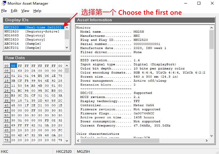 - Method: Connect the GPU of the computer host to the main monitor using an HDMI-compatible2.0 or HDMI-compatible2.1 cable (very important: it is the output of the GPU, directly connected to the main display without going through the DMA video overlay box). On the computer host, select the most suitable GPU output resolution and refresh rate (such as 2560x1440 at 144 , 1920x1080 at 240, etc.) to enable the monitor to display normally. Then install the MonitorAssetManager with the file name of mi_setup.exe. After installing, run the Monlnfo.exe and wait for it to open.