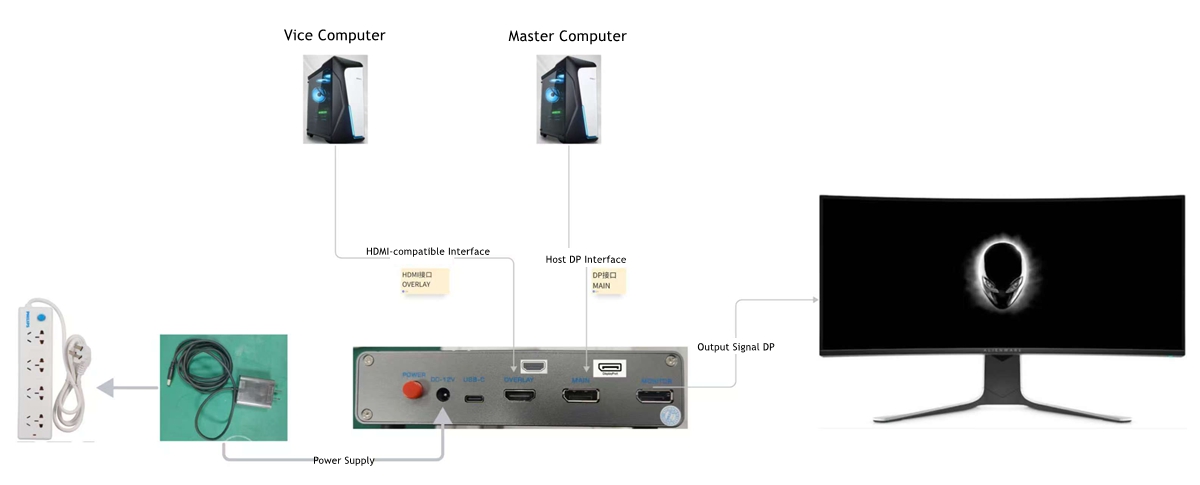 After saving the Bin file, insert the Type-C cable into the Type-C port of the DMA video overlay box, and connect the other end of the USB to the computer where the Bin file was just saved. (At this point, restore the normal wiring of the DMA video overlay box, that is, connect the HDMI output cable of the computer host GPU to the box, and connect the box output cable to the main monitor.) Power it on, and then turn on the box.