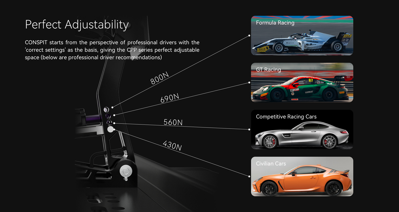 - Perfect adjustability: CONSPIT starts from the perspective of professional drivers with the 'correct settings' as the basis, giving the CPP series perfect adjustable space (below are professional driver recommendations): 800N for formula racing, 690N for GT racing, 560N for competitive racing cars and 430N for civilian cars