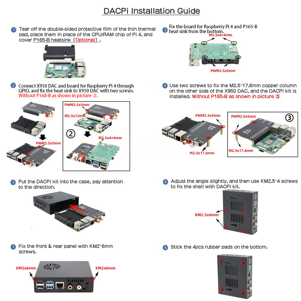 DACPi adopts modular design, including three parts: X950 DAC Shield, cooling system (P165-B embedded heat sink), and a NUC style aluminum case. Just simply assemble them with a motherboard for Raspberry Pi 4.