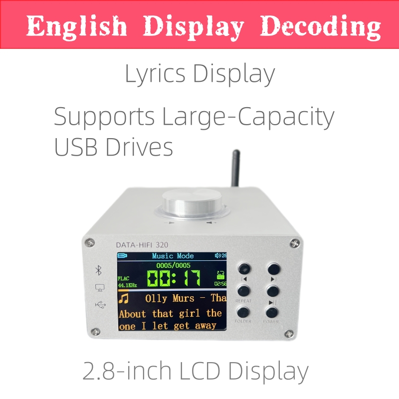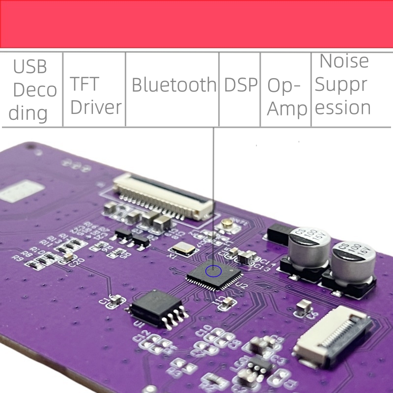 - KCX_TFT2.8_PLAYER02 is a multifunctional high-fidelity stereo audio decoding board that integrates Bluetooth audio decoding, TF card, U disk music file decoding, computer USB sound card, and LINE input. This board uses a 2.8-inch 320X240 pixel IPS color screen to display the playback status and decoding related information. It also supports analog audio and digital audio (I2S) output functions. When playing U disk/TF card in music mode, it supports decoding file formats MP3/WAV/WMA/FLAC/APE. If there is a lyrics file, it supports parsing lrc lyrics files to achieve synchronous display of lyrics. If there is no lyrics file, it displays 32 segments of real-time dynamic spectrum. In Bluetooth mode, it supports SBC/AAC audio transmission protocol, supports Bluetooth lyrics song name and other ID3 information display, and supports spectrum display. LINE mode supports stereo line audio input, and supports left and right channel envelope diagram display + spectrum display. USB sound card mode supports envelope diagram + spectrum display. The built-in equalizer has 7 preset EQ scenes + 1 custom EQ scene, which can be well matched with the speaker and personal listening preferences to select and adjust the sound effect that suits you. This product supports simplified Chinese, traditional Chinese, and English display. The panel of this product is made of aluminum alloy.