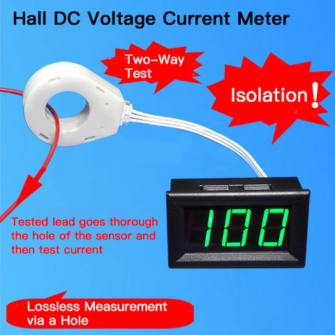 The DC Hall ammeter uses a Hall current sensor, which breaks all the limitations and restrictions of the ammeter using ordinary metal shunts. This meter is powered by DC5-120V power supply. It is very convenient to directly measure the battery (not included) voltage of electric vehicles, automobiles, etc.