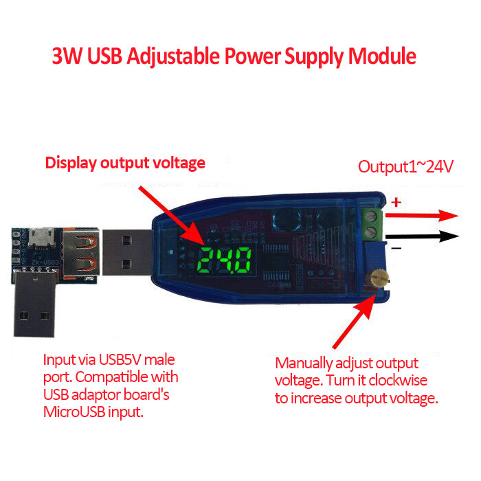 As long as you have a mobile phone charger and a USB 5V adapter, you can easily output an adjustable voltage from 1V to 24V with a power of 3W. When it is used with a USB adapter board, microUSB is used as an input, which is very convenient to use. The voltage regulator uses a precision long potentiometer, which can be adjusted manually, requiring no screwdriver. With exquisite shell, output voltage display is with green light or red light for your choice.