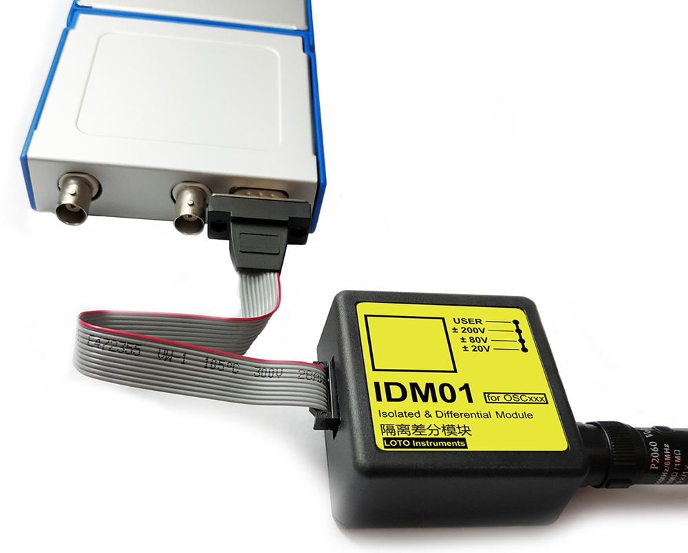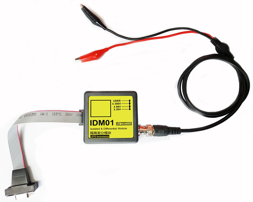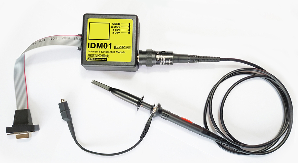 The module IDM01 is an active probe that could isolate differential input. Its input interface is BNC and output interface is VGA with flat wire. The input signal and output signal are totally isolated, and the input is differential.