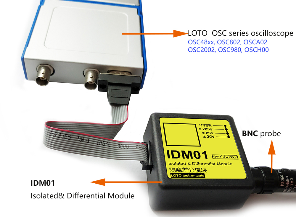 IDM01 could be used for LOTO oscilloscope. When plugging IDM01 to scope for LOTO by the VGA interfaces, the channel B of oscilloscope will become isolated differential input.