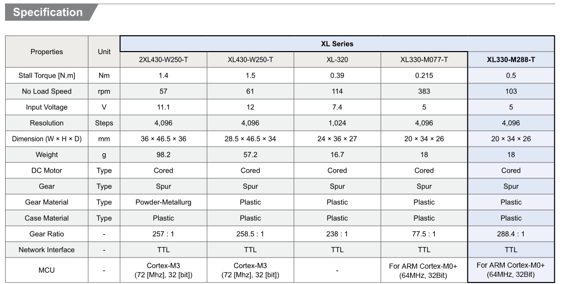 The XL330 series is a compact and lightweight servo. It is a very useful solution when you are building small applications or operating the DYNAMIXEL in tight spaces.