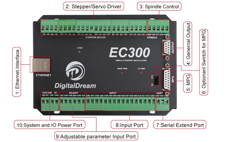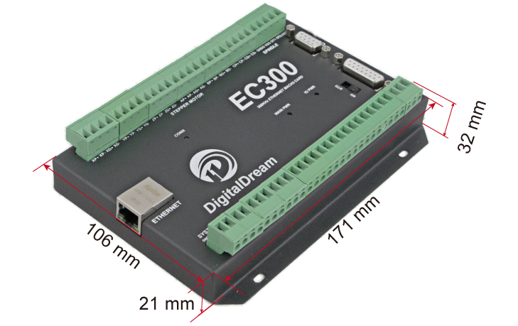 The EC300 is a high-performance external motion controller for Mach 3 software, with Ethernet interface, supporting standard MPG and Digital Dream MPG. The device can communicate with a connection to a control computer’s network. The network connection can be built with direct connection or via router/Swith devices.