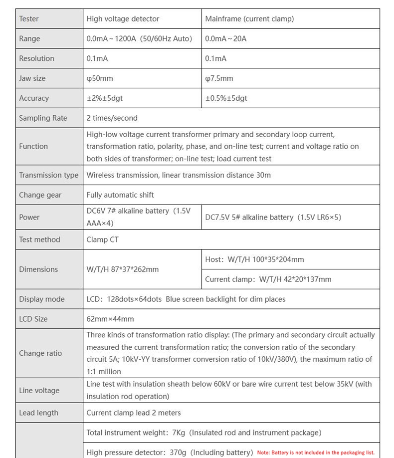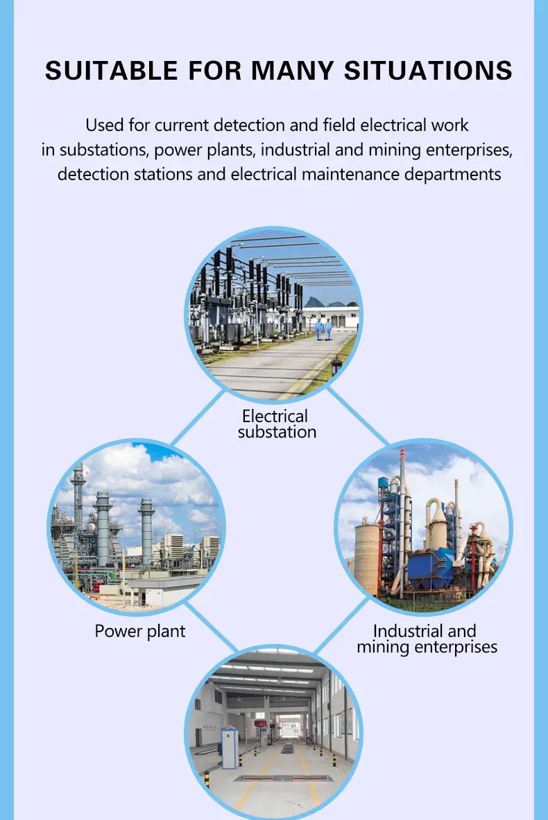 - High-voltage current measurement range of 0.0mA ~ 1200A, low-voltage current measurement range of 0.0mA ~ 20A. High-voltage detector current signal using wireless transmission technology, connecting the insulation rod, through the push or pull back the insulation rod can easily clamp or evacuation of the measured wire, save time and fast.