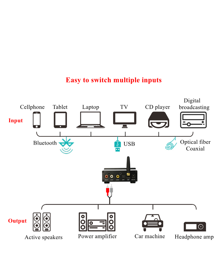 - Multiple input. Support USB, Bluetooth, optical fiber, coaxial input, with volume adjustment, can be used as preamp
