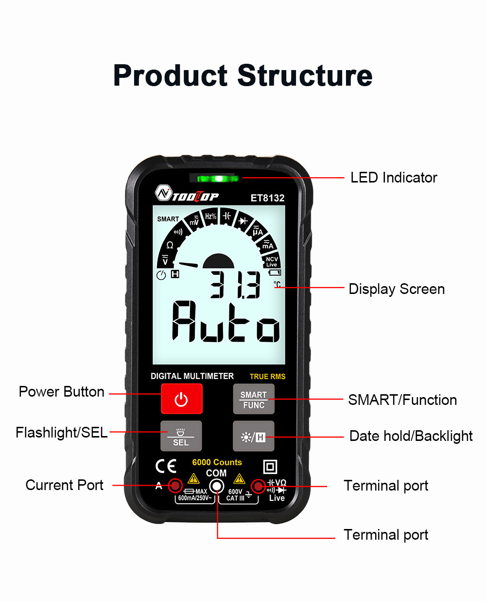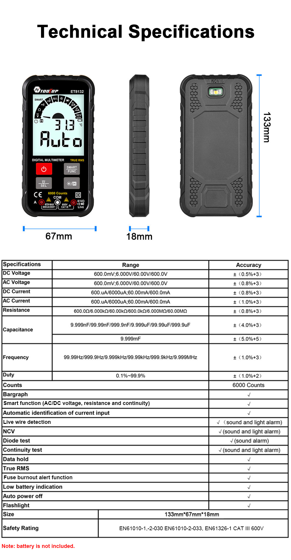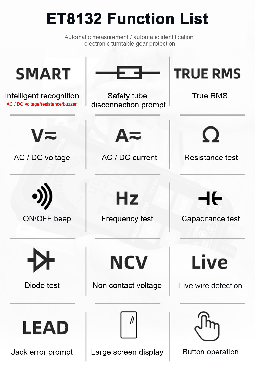ET8132 600V 600mA Mini Multimeter 6000 Counts Digital Multimeter for NCV & Live Wire Detection