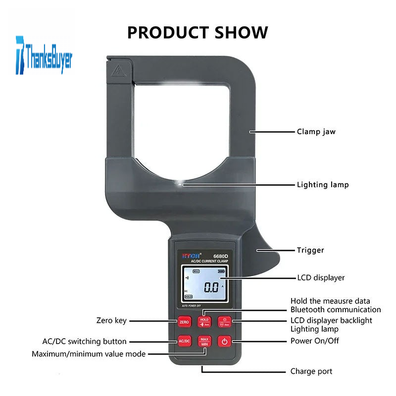 - ETCR6680D large caliber DC/AC Clamp Current Meter, also known as clamp type current meter, which is used for measurement of AC/DC current. The meter adopt with Hall effect sensor and unique CT digital integration technology, the characteristics of small size, high precision and perfect function, which widely used in power, communications, meteorology, railways, oil fields, construction, metrology, scientific research and teaching units, industrial and mining enterprises and other fields. ETCR6680D Large Caliber DC/AC Clamp Current Meter with DC/AC true RMS measurement, maximum value / minimum value / average value and other test functions. The meter with data hold function, Bluetooth communication function, equipped with large capacity rechargeable lithium battery and type-c charging port, which is new type essential tool for electrical safety testing.
